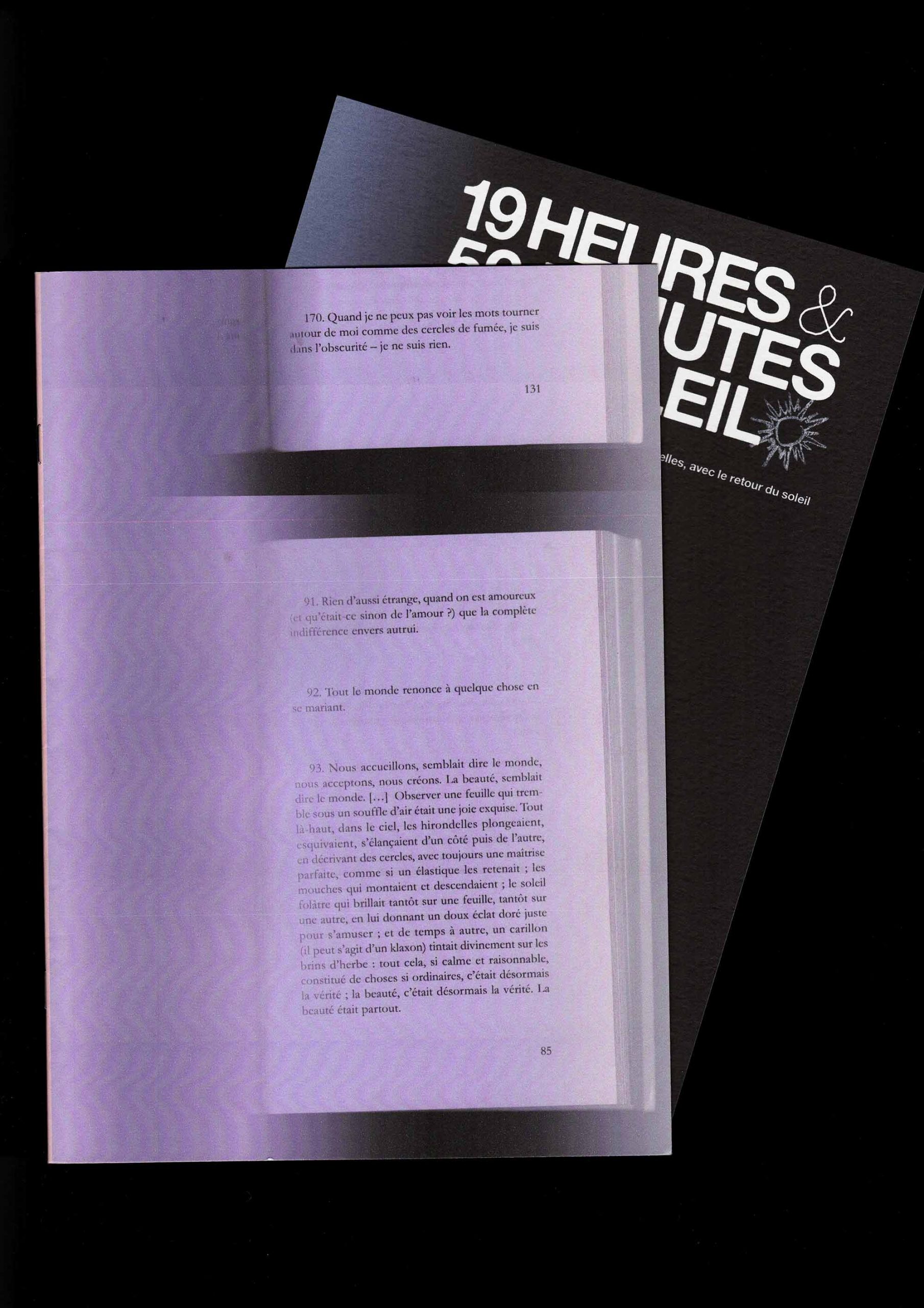 JCM : Ma conception du livre a quelque chose de démocratique par son approche et sa démarche d’élaboration: utiliser le quotidien comme matière première, partager des anecdotes personnelles pouvant avoir un écho collectif, utiliser des matériaux « simples » ou de récupération. Une tentative plutôt de mettre en livre des singularités originaires, pouvant être partagées par d’autres. À l’image de 19 heures & 59 minutes, une publication pour attester du manque de lumière en hiver à Bruxelles. Le titre comme annonce du temps d’ensoleillement au mois de décembre 2023. Un livre réconfort, composé à partir des pages de ceux de ma bibliothèque mentionnant lumière, chaleur, couleur. Il ne laisse pas indifférent quiconque à passer au moins une année de sa vie en Belgique.