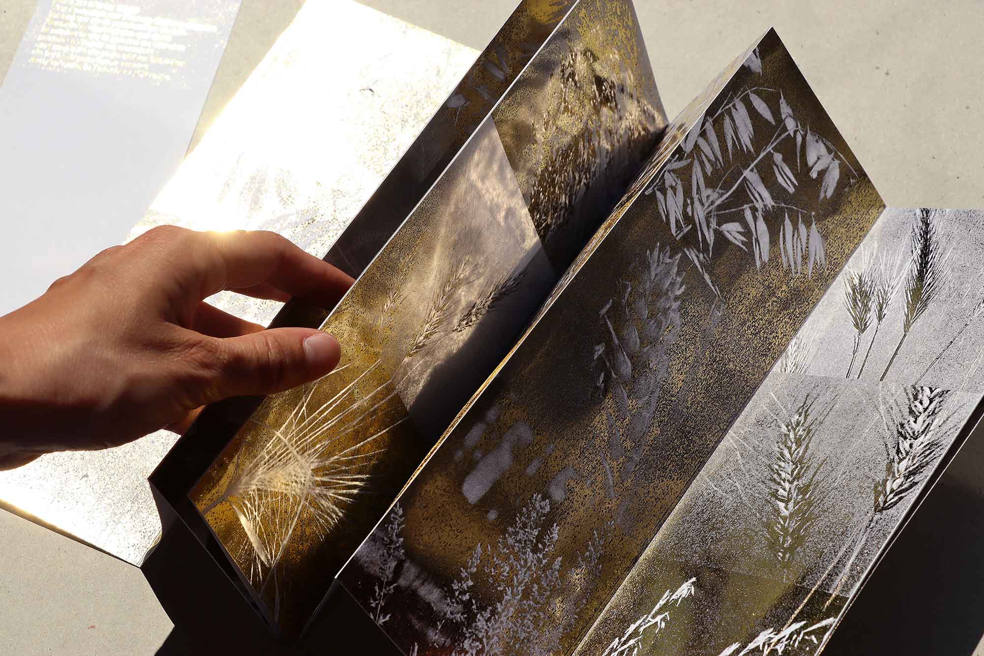 Le jeu d’impression dorée caractéristique de La fin de labondance, est une technique que j’aime appeler dorure low-cost. Elle résulte de la combinaison de trois éléments : des impressions laser, des films d’Oeser –traditionnellement utilisés en reliure– et une plastifieuse. Puis, de l’association de savoir-faire provenant de processus de création différents.