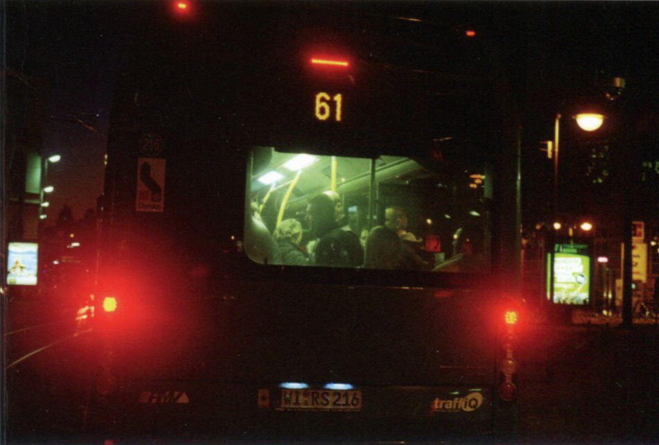 Une des sections du livre s’appelant « La couverture des livres », il parait logique d’entamer la lecture par l’illustration qui ouvre – il serait inexact de dire « qui orne » – Les amours suivants. Il s’agit d’une photo de nuit, en couleurs, qui montre l’arrière d’un bus, violemment éclairé de l’intérieur, que l’on découvre dans un espace urbain typique mais peu détaillé. La composition de cette image frappe d’abord par sa symétrie. Le bus et plus particulièrement le rectangle verdâtre de la fenêtre arrière occupent plus ou moins le centre de la photo. Quant au numéro de la ligne (« 61 »), surligné d’un trait lumineux rouge, il est lui aussi, pour le dire en termes typographiques, parfaitement « justifié ». Enfin, les feux de position du car figurent avec le trait rouge en haut de l’image comme un triangle qui se détache fortement sur les teints sombres de l’ensemble de la photo. Toutefois, cette composition bien balancée se voit aussi délicatement déséquilibrée. Certains éléments de l’image penchent légèrement à gauche ou à droite, les objets photographiés ne le sont pas frontalement mais un peu de biais, la distance des taches de couleur les plus voyantes par rapport au cadre de l’image est sujette à variations, quelques autres taches lumineuses brouillent encore davantage la symétrie de l’ensemble, lequel accède ainsi à un degré d’organisation plus complexe où chaque effet de structure cède vite la place à des effets suivants, à la fois plus souples et plus sophistiques.